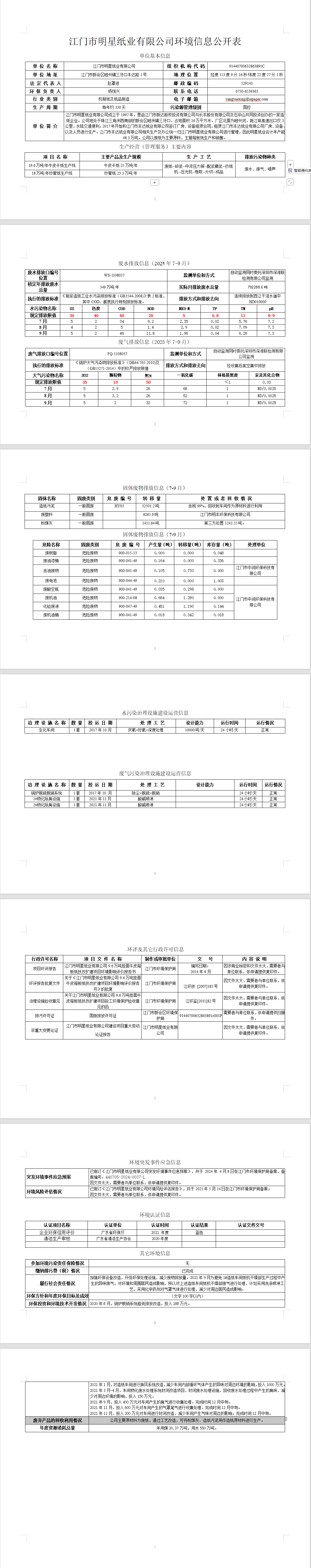 江门市明星纸业有限公司2025年第三季度环保信息公开